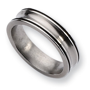 Titanium ring has a polished concave center and black enameled edges. Width: 6mm. Made of aircraft grade titanium in the USA. Comfort fit. Available while supplies last. Aircraft grade titanium [Ti 6Al-4V] is comprised of 90% titanium, 6% aluminum, 4% vanadium. It is hypoallergenic and guaranteed not to cause allergic reactions, skin irritations or discoloration of any sort. While pure grades of titanium [99.9%] used in most other titanium jewelry is very durable, Ti 6Al-4V is 2x stronger and 2.5x to 5x harder. This alloy has a tensile strength of up to 150,000 psi and a Brinell hardness value of 330.