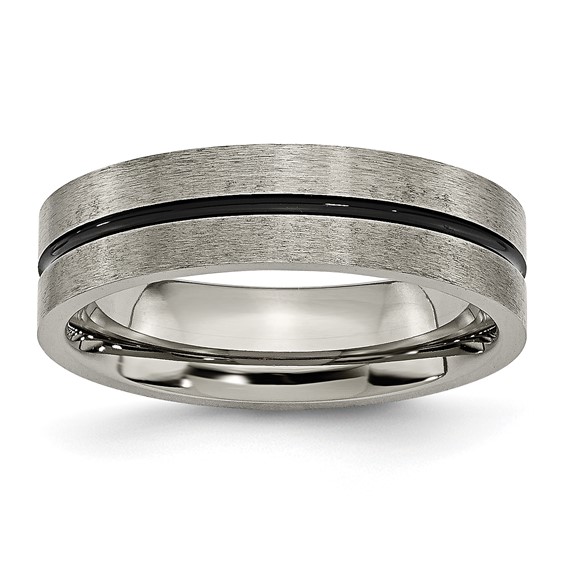 Flat titanium wedding band has a brushed finish. Black accent in center. Width: 6mm. Made of aircraft grade titanium in China. Comfort fit. Aircraft grade titanium [Ti 6Al-4V] is comprised of 90% titanium, 6% aluminum, 4% vanadium. It is hypoallergenic and guaranteed not to cause allergic reactions, skin irritations or discoloration of any sort. While pure grades of titanium [99.9%] used in most other titanium jewelry is very durable, Ti 6Al-4V is 2x stronger and 2.5x to 5x harder. This alloy has a tensile strength of up to 150,000 psi and a Brinell hardness value of 330.