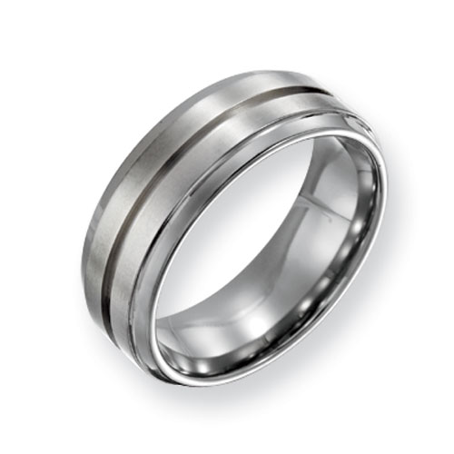 Ring features satin grooved center and polished edges. Width: 8mm. Made of aircraft grade titanium in China. Comfort fit. Aircraft grade titanium [Ti 6Al-4V] is comprised of 90% titanium, 6% aluminum, 4% vanadium. It is hypoallergenic and guaranteed not to cause allergic reactions, skin irritations or discoloration of any sort. While pure grades of titanium [99.9%] used in most other titanium jewelry is very durable, Ti 6Al-4V is 2x stronger and 2.5x to 5x harder. This alloy has a tensile strength of up to 150,000 psi and a Brinell hardness value of 330.