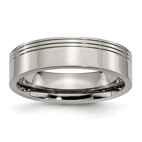 Titanium wedding band features three offset grooves. Polished finish, flat center. Width: 6mm. Comfort fit. Made of commercially pure [CP] titanium in China.