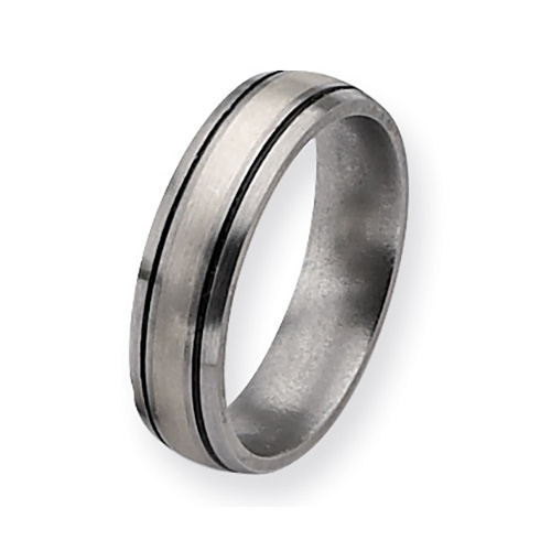 Titanium ring has a sterling silver inlay and two antiqued black stripes. Brushed finish, domed center. Width: 6mm. Made of aircraft grade titanium. Comfort fit. Import.Aircraft grade titanium [Ti 6Al-4V] is comprised of 90% titanium, 6% aluminum, 4% vanadium. It is hypoallergenic and guaranteed not to cause allergic reactions, skin irritations or discoloration of any sort. While pure grades of titanium [99.9%] used in most other titanium jewelry is very durable, Ti 6Al-4V is 2x stronger and 2.5x to 5x harder. This alloy has a tensile strength of up to 150,000 psi and a Brinell hardness value of 330.