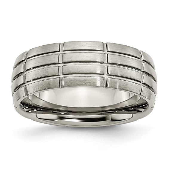 Titanium ring has a pattern of cut rectangles all the way around. Satin finish, domed center. Width: 8mm. Comfort fit. Made of commercially pure [CP] titanium in China.