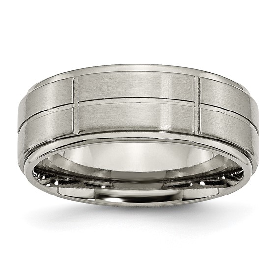 Titanium wedding band has a satin flat center and grooved design. Polished edges. Width: 8mm. Made of commercially pure [CP] titanium in China.