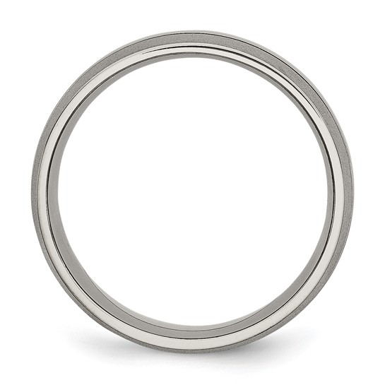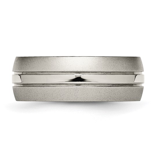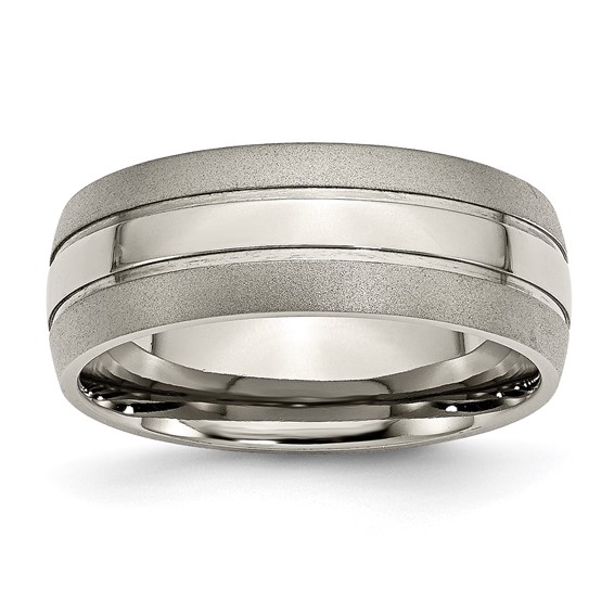 Titanium wedding band has brushed edges and polished center. Two grooves. Width: 8mm. Made of commercially pure [CP] titanium in China.