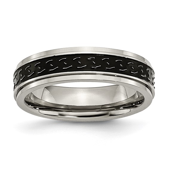 Black enamel braid design. Step down edges. Brushed finish. Width: 6mm. Comfort fit. Made of commercially pure [CP] titanium in China.