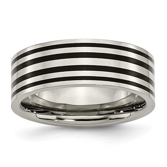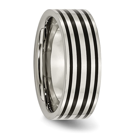 Titanium ring has four black enamel stripes. Polished flat center. Width: 8mm. Comfort fit. Made of commercially pure [CP] titanium in China. Ships from USA.
