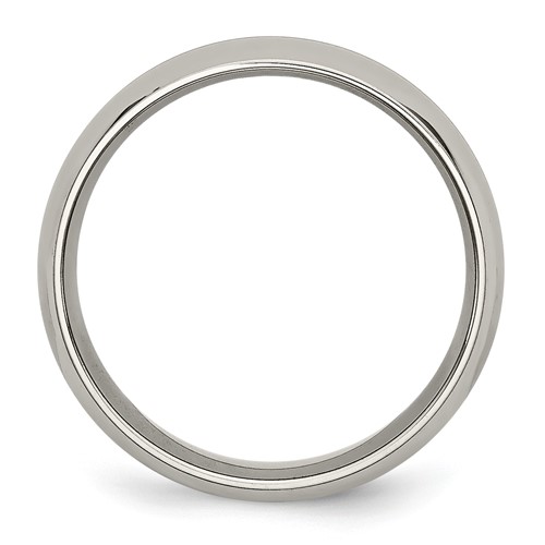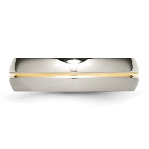 This domed titanium band features a 14k yellow gold plated center. Polished finish. Width: 6mm. Comfort fit. Made of commercially pure [CP] titanium in China.