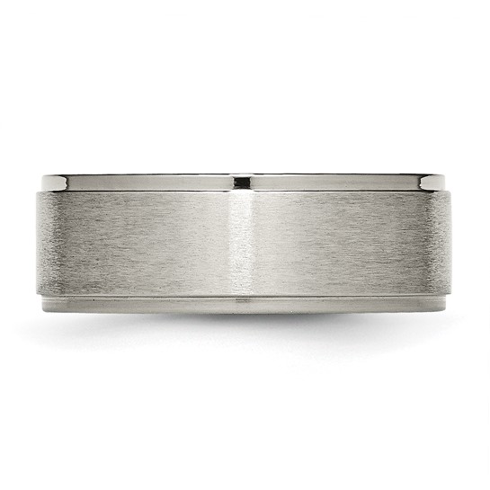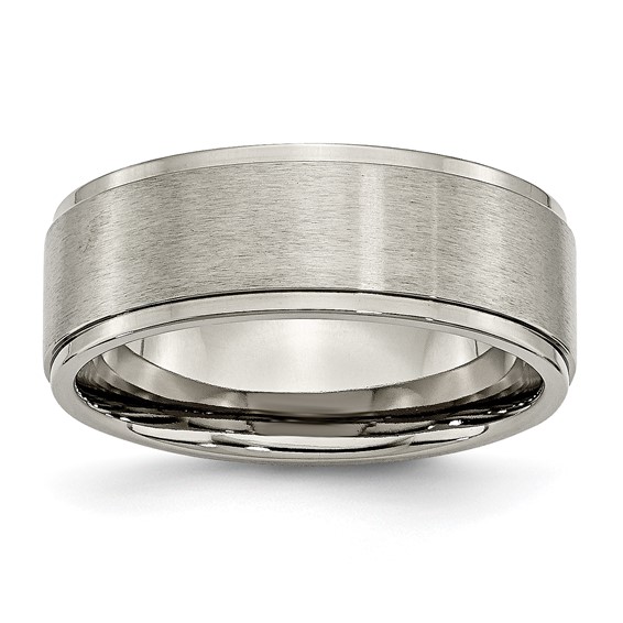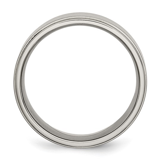 Titanium wedding band has a brushed flat center and polished ridged edges. Width: 8mm. Comfort fit. Made of commercially pure [CP] titanium in China.