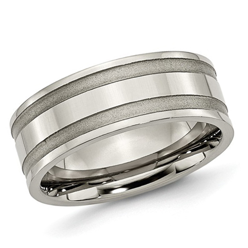 Titanium ring has a polished flat center, brushed grooves. Width: 8mm. Comfort fit. Made of commercially pure [CP] titanium in China.