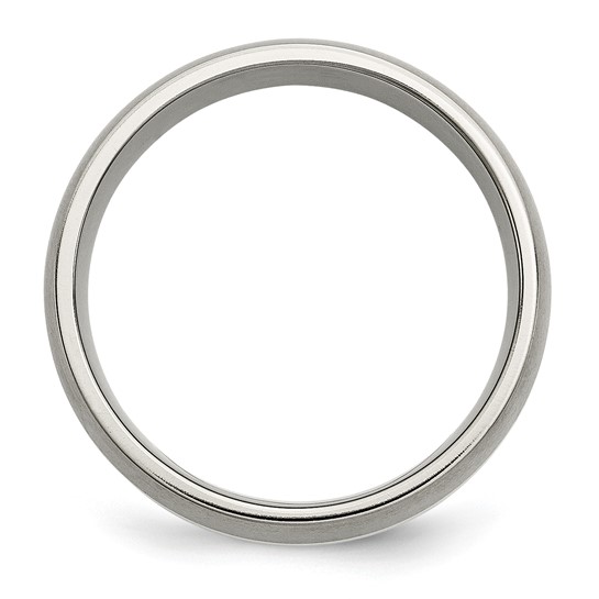 Titanium wedding band has a sterling silver inlay. Satin finish, flat center. Width: 8mm. Comfort fit. Made of commercially pure [CP] titanium in China.