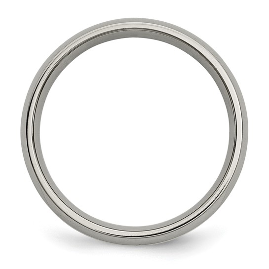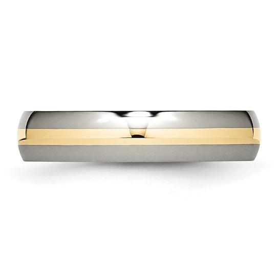 Polished domed titanium wedding band features a 14kt yellow gold inlay. Width: 5mm. Comfort fit. Made of commercially pure [CP] titanium. Import.