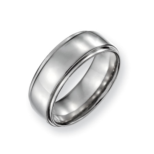 Titanium wedding band has a domed center and ridged edges. Polished finish. Width: 8mm. Made of aircraft grade titanium in China. Comfort fit. Aircraft grade titanium [Ti 6Al-4V] is comprised of 90% titanium, 6% aluminum, 4% vanadium. It is hypoallergenic and guaranteed not to cause allergic reactions, skin irritations or discoloration of any sort. While pure grades of titanium [99.9%] used in most other titanium jewelry is very durable, Ti 6Al-4V is 2x stronger and 2.5x to 5x harder. This alloy has a tensile strength of up to 150,000 psi and a Brinell hardness value of 330.