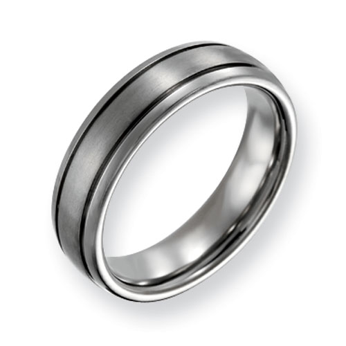 Brushed flat center, polished ridged edges. Width: 6mm. Made of aircraft grade titanium in the USA. Comfort fit. Aircraft grade titanium [Ti 6Al-4V] is comprised of 90% titanium, 6% aluminum, 4% vanadium. It is hypoallergenic and guaranteed not to cause allergic reactions, skin irritations or discoloration of any sort. While pure grades of titanium [99.9%] used in most other titanium jewelry is very durable, Ti 6Al-4V is 2x stronger and 2.5x to 5x harder. This alloy has a tensile strength of up to 150,000 psi and a Brinell hardness value of 330.