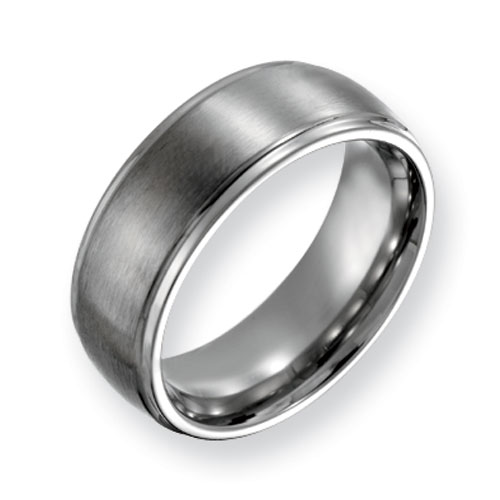Satin titanium band features polished ridged edges. Width: 8mm. Made of aircraft grade titanium in China. Comfort fit. Aircraft grade titanium [Ti 6Al-4V] is comprised of 90% titanium, 6% aluminum, 4% vanadium. It is hypoallergenic and guaranteed not to cause allergic reactions, skin irritations or discoloration of any sort. While pure grades of titanium [99.9%] used in most other titanium jewelry is very durable, Ti 6Al-4V is 2x stronger and 2.5x to 5x harder. This alloy has a tensile strength of up to 150,000 psi and a Brinell hardness value of 330.
