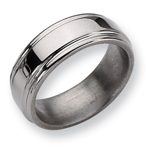 Polished titanium wedding band features grooved edges. Width: 8mm. Made of aircraft grade titanium in China. Comfort fit. Aircraft grade titanium [Ti 6Al-4V] is comprised of 90% titanium, 6% aluminum, 4% vanadium. It is hypoallergenic and guaranteed not to cause allergic reactions, skin irritations or discoloration of any sort. While pure grades of titanium [99.9%] used in most other titanium jewelry is very durable, Ti 6Al-4V is 2x stronger and 2.5x to 5x harder. This alloy has a tensile strength of up to 150,000 psi and a Brinell hardness value of 330.