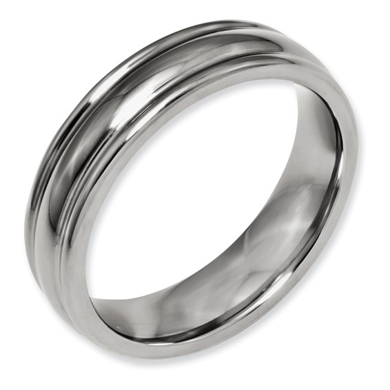 Polished titanium band features grooves. Width: 6mm. Made of aircraft grade titanium in China. Comfort fit. Aircraft grade titanium [Ti 6Al-4V] is comprised of 90% titanium, 6% aluminum, 4% vanadium. It is hypoallergenic and guaranteed not to cause allergic reactions, skin irritations or discoloration of any sort. While pure grades of titanium [99.9%] used in most other titanium jewelry is very durable, Ti 6Al-4V is 2x stronger and 2.5x to 5x harder. This alloy has a tensile strength of up to 150,000 psi and a Brinell hardness value of 330.