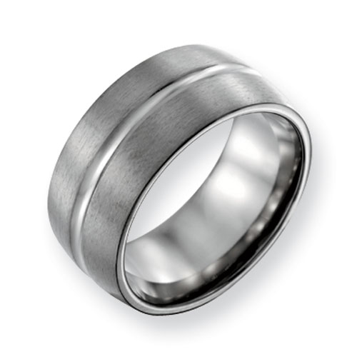 This wide titanium band has brushed sides and a polished groove in the center. Width: 10mm. Made of aircraft grade titanium in China. Comfort fit. Aircraft grade titanium [Ti 6Al-4V] is comprised of 90% titanium, 6% aluminum, 4% vanadium. It is hypoallergenic and guaranteed not to cause allergic reactions, skin irritations or discoloration of any sort. While pure grades of titanium [99.9%] used in most other titanium jewelry is very durable, Ti 6Al-4V is 2x stronger and 2.5x to 5x harder. This alloy has a tensile strength of up to 150,000 psi and a Brinell hardness value of 330.