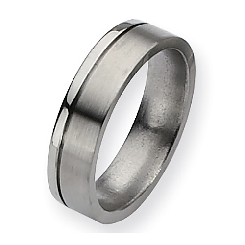 This titanium band features a brushed flat center with one polished edge. Groove separates the two finishes. Width: 6mm. Made of aircraft grade titanium. Import. Comfort fit. Aircraft grade titanium [Ti 6Al-4V] is comprised of 90% titanium, 6% aluminum, 4% vanadium. It is hypoallergenic and guaranteed not to cause allergic reactions, skin irritations or discoloration of any sort. While pure grades of titanium [99.9%] used in most other titanium jewelry is very durable, Ti 6Al-4V is 2x stronger and 2.5x to 5x harder. This alloy has a tensile strength of up to 150,000 psi and a Brinell hardness value of 330.