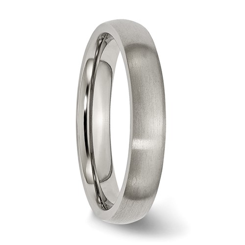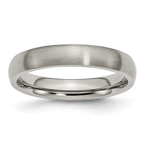 Titanium 4mm brushed wedding band is comfort fit. Made of aircraft grade titanium in China. Aircraft grade titanium [Ti 6Al-4V] is comprised of 90% titanium, 6% aluminum, 4% vanadium. It is hypoallergenic and guaranteed not to cause allergic reactions, skin irritations or discoloration of any sort. While pure grades of titanium [99.9%] used in most other titanium jewelry is very durable, Ti 6Al-4V is 2x stronger and 2.5x to 5x harder. This alloy has a tensile strength of up to 150,000 psi and a Brinell hardness value of 330.