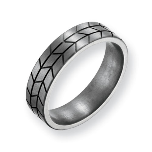 Men's titanium band features tire tread design. Brushed finish, flat center. Width: 6mm. Made of aircraft grade titanium in China. Comfort fit. Aircraft grade titanium [Ti 6Al-4V] is comprised of 90% titanium, 6% aluminum, 4% vanadium. It is hypoallergenic and guaranteed not to cause allergic reactions, skin irritations or discoloration of any sort. While pure grades of titanium [99.9%] used in most other titanium jewelry is very durable, Ti 6Al-4V is 2x stronger and 2.5x to 5x harder. This alloy has a tensile strength of up to 150,000 psi and a Brinell hardness value of 330.