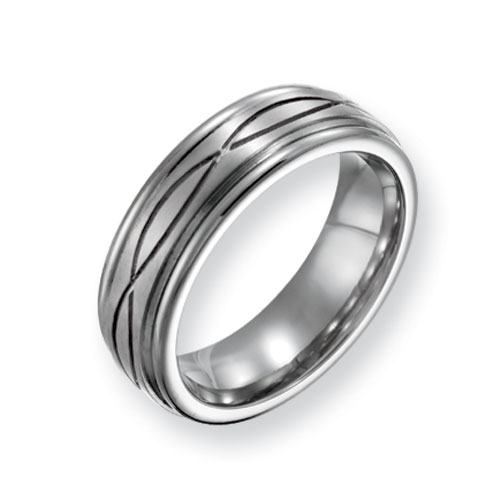 Men's titanium band features criss cross design. Satin finish, flat center. Width: 7mm. Made of aircraft grade titanium in China. Comfort fit. Aircraft grade titanium [Ti 6Al-4V] is comprised of 90% titanium, 6% aluminum, 4% vanadium. It is hypoallergenic and guaranteed not to cause allergic reactions, skin irritations or discoloration of any sort. While pure grades of titanium [99.9%] used in most other titanium jewelry is very durable, Ti 6Al-4V is 2x stronger and 2.5x to 5x harder. This alloy has a tensile strength of up to 150,000 psi and a Brinell hardness value of 330.