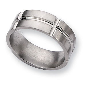 Men's titanium band features polished, intersecting grooves. Brushed finish. Width: 8mm. Made of aircraft grade titanium in China. Comfort fit. Aircraft grade titanium [Ti 6Al-4V] is comprised of 90% titanium, 6% aluminum, 4% vanadium. It is hypoallergenic and guaranteed not to cause allergic reactions, skin irritations or discoloration of any sort. While pure grades of titanium [99.9%] used in most other titanium jewelry is very durable, Ti 6Al-4V is 2x stronger and 2.5x to 5x harder. This alloy has a tensile strength of up to 150,000 psi and a Brinell hardness value of 330.
