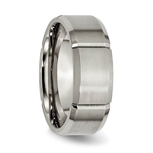 Men's titanium band features polished grooves and a brushed flat center. Width: 8mm. Made of aircraft grade titanium. Import. Comfort fit. Aircraft grade titanium [Ti 6Al-4V] is comprised of 90% titanium, 6% aluminum, 4% vanadium. It is hypoallergenic and guaranteed not to cause allergic reactions, skin irritations or discoloration of any sort. While pure grades of titanium [99.9%] used in most other titanium jewelry is very durable, Ti 6Al-4V is 2x stronger and 2.5x to 5x harder. This alloy has a tensile strength of up to 150,000 psi and a Brinell hardness value of 330.