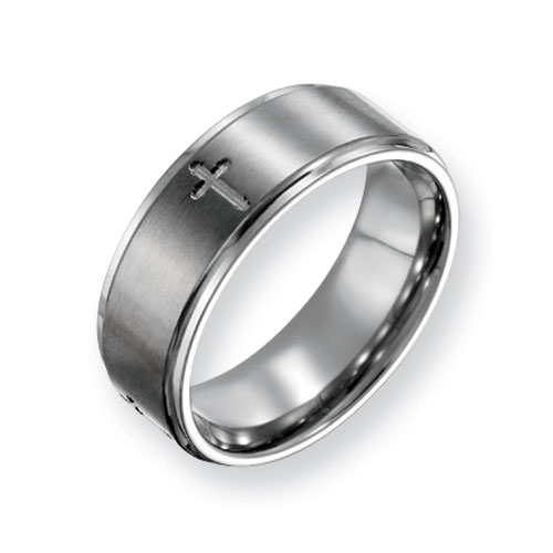 This men's titanium band features four engraved crosses. Brushed flat center, polished ridged edges. Width: 8mm. Comfort fit. Import.