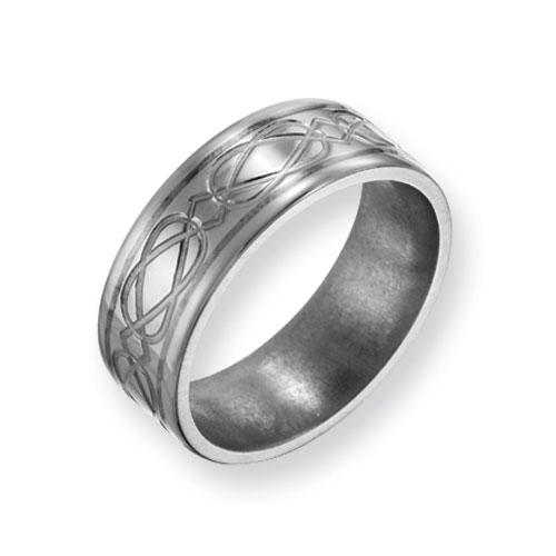 This men's titanium wedding band features Celtic knot design. Polished flat center, two sterling silver inlays. Width: 8mm. Made of aircraft grade titanium in China. Comfort fit. Aircraft grade titanium [Ti 6Al-4V] is comprised of 90% titanium, 6% aluminum, 4% vanadium. It is hypoallergenic and guaranteed not to cause allergic reactions, skin irritations or discoloration of any sort. While pure grades of titanium [99.9%] used in most other titanium jewelry is very durable, Ti 6Al-4V is 2x stronger and 2.5x to 5x harder. This alloy has a tensile strength of up to 150,000 psi and a Brinell hardness value of 330.
