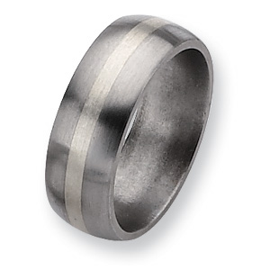 Titanium wedding band has a brushed domed center and 2mm sterling silver inlay. Ring width: 8mm. Made of aircraft grade titanium. Import. Comfort fit. Aircraft grade titanium [Ti 6Al-4V] is comprised of 90% titanium, 6% aluminum, 4% vanadium. It is hypoallergenic and guaranteed not to cause allergic reactions, skin irritations or discoloration of any sort. While pure grades of titanium [99.9%] used in most other titanium jewelry is very durable, Ti 6Al-4V is 2x stronger and 2.5x to 5x harder. This alloy has a tensile strength of up to 150,000 psi and a Brinell hardness value of 330.