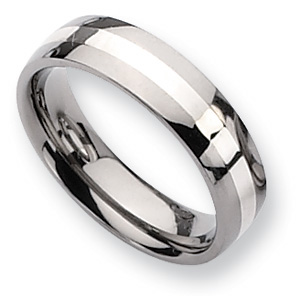 Titanium wedding band has a polished domed center and 2mm sterling silver inlay. Width: 6mm. Made of aircraft grade titanium. Comfort fit. Import. Aircraft grade titanium [Ti 6Al-4V] is comprised of 90% titanium, 6% aluminum, 4% vanadium. It is hypoallergenic and guaranteed not to cause allergic reactions, skin irritations or discoloration of any sort. While pure grades of titanium [99.9%] used in most other titanium jewelry is very durable, Ti 6Al-4V is 2x stronger and 2.5x to 5x harder. This alloy has a tensile strength of up to 150,000 psi and a Brinell hardness value of 330.