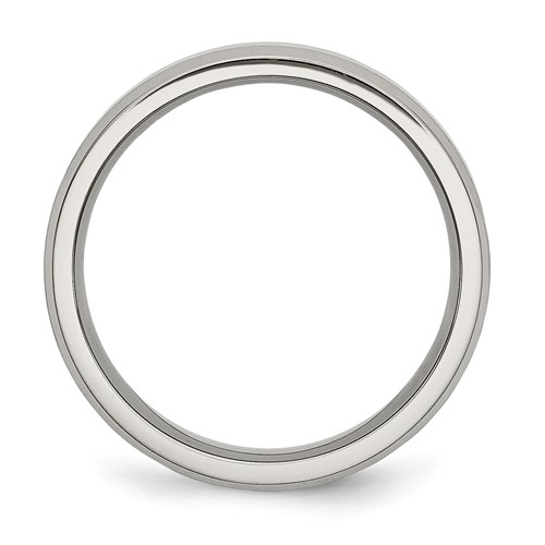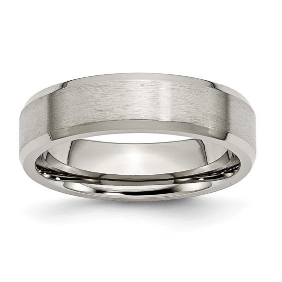 This men's titanium band features a brushed center with polished beveled edges. Width: 6mm. Made of aircraft grade titanium. Comfort fit. Import. Aircraft grade titanium [Ti 6Al-4V] is comprised of 90% titanium, 6% aluminum, 4% vanadium. It is hypoallergenic and guaranteed not to cause allergic reactions, skin irritations or discoloration of any sort. While pure grades of titanium [99.9%] used in most other titanium jewelry is very durable, Ti 6Al-4V is 2x stronger and 2.5x to 5x harder. This alloy has a tensile strength of up to 150,000 psi and a Brinell hardness value of 330.