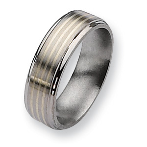 Brushed flat titanium wedding band features three sterling silver inlays. Polished ridged edges. Width: 8mm. Made of aircraft grade titanium in the USA. Comfort fit. Aircraft grade titanium [Ti 6Al-4V] is comprised of 90% titanium, 6% aluminum, 4% vanadium. It is hypoallergenic and guaranteed not to cause allergic reactions, skin irritations or discoloration of any sort. While pure grades of titanium [99.9%] used in most other titanium jewelry is very durable, Ti 6Al-4V is 2x stronger and 2.5x to 5x harder. This alloy has a tensile strength of up to 150,000 psi and a Brinell hardness value of 330.