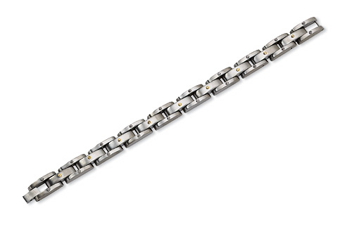 Brushed titanium bracelet features 24k plated screw accents. Length: 8.5 inches. Made of commercially pure [CP] titanium in China.