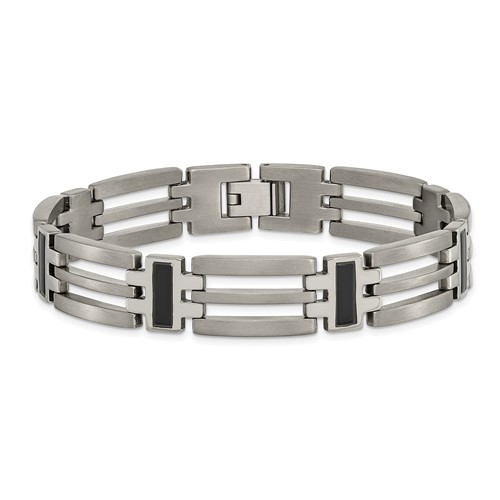 Brushed and polished titanium bracelet features black enamel. Bracelet length: 8.5 inches. Fold-over clasp. Made of commercially pure [CP] titanium in China.