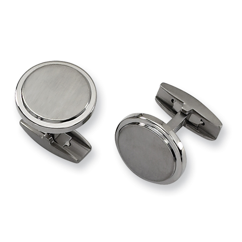 Round titanium cuff links have a brushed center and polished edges. Item size: 3/4in x 3/4in. Approximate weight: 9.1 grams. Imported. Engravable.