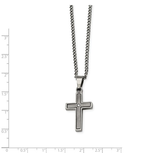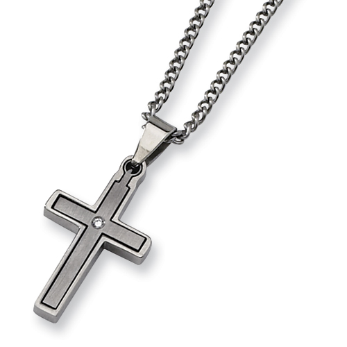 Brushed and polished titanium cross has a .035 ct round diamond accent. The cross in the middle is movable and not fixed in place. This item includes a 22-inch stainless steel chain. Fancy lobster clasp. Import. Weight: 9.7 grams.