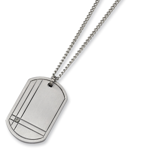This titanium necklace features a 3.5pt round full cut diiamond. Brushed finish. This item includes a 22-inch stainless steel chain with fancy lobster clasp. Available while supplies last.