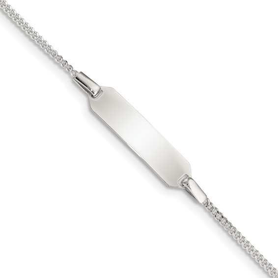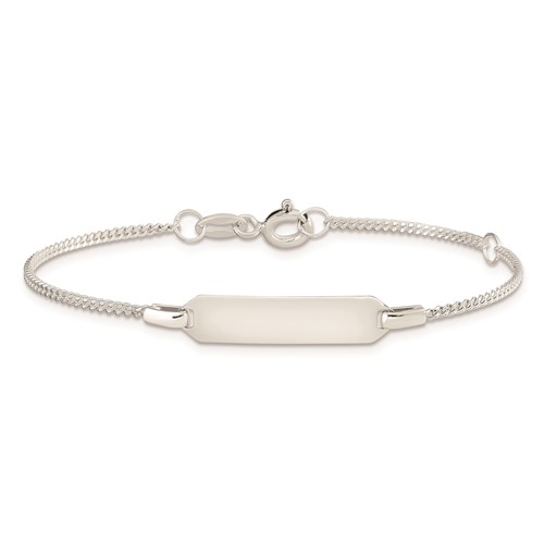 This children's ID curb link bracelet is made of sterling silver. Length: 6in. Engravable bracelet plate: 7/8in x 3/16in. Link width: 1mm. Weight: 1.6 grams. Spring ring clasp. Import.