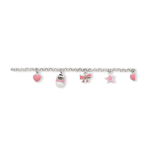 Pink enameled baby charm bracelet is made of polished sterling silver. Bracelet has pink shoe, heart, bow and star charms. Length: 5 1/2in. Chain width: 4mm. Weight: 5.67 grams. Lobster clasp. Made in the USA.