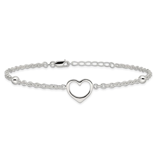 This sold sterling silver open heart charm anklet has two polished bead accents. Adjustable length from 9in to 10in. Approximate weight: 5.5 grams. Lobster clasp. Made in India. Ships from USA.