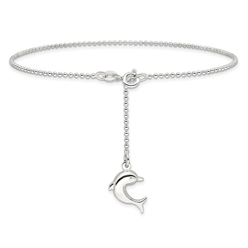 Polished, beaded sterling silver dolphin anklet weighs 2.25 grams. Dolphin charm is 3-D, hollow. Made in the USA.