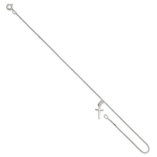 Sterling silver cross dangles from a 9in anklet. Box chain. Weight: 1.7 grams. Spring ring clasp. Made in Italy.