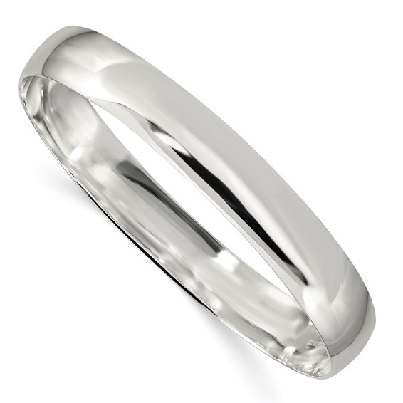 This solid smooth slip-on bangle bracelet is made of polished sterling silver. Bracelet length: 7.5in, width: 9.75mm. Weight: 21.7 grams. Import.