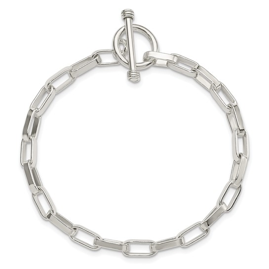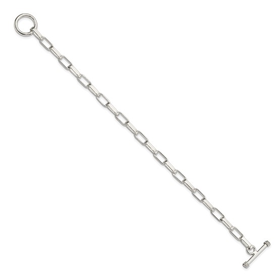 This hand made sterling silver toggle bracelet has slender rectangular links. Length: 7.5in. Link width: 5mm. Approximate weight: 8.42 grams. Toggle clasp. Made in India. Ships from USA.