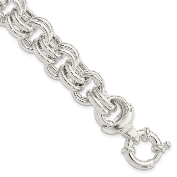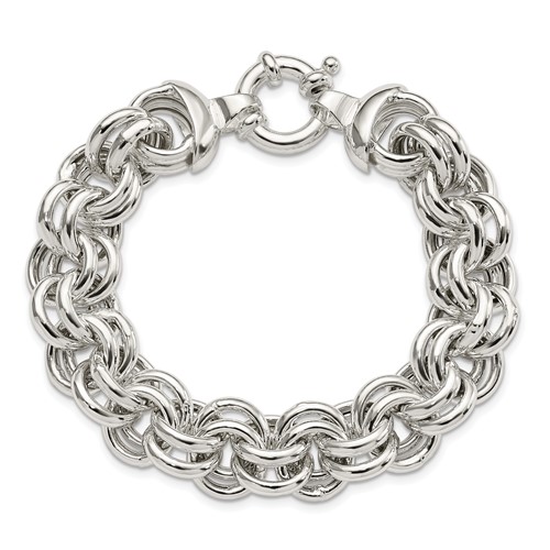 This solid sterling silver bracelet has wide double circle links and a spring ring clasp. Length: 8in. Width: 15mm. Weight: 31.7 grams. Made in India. Ships from USA.