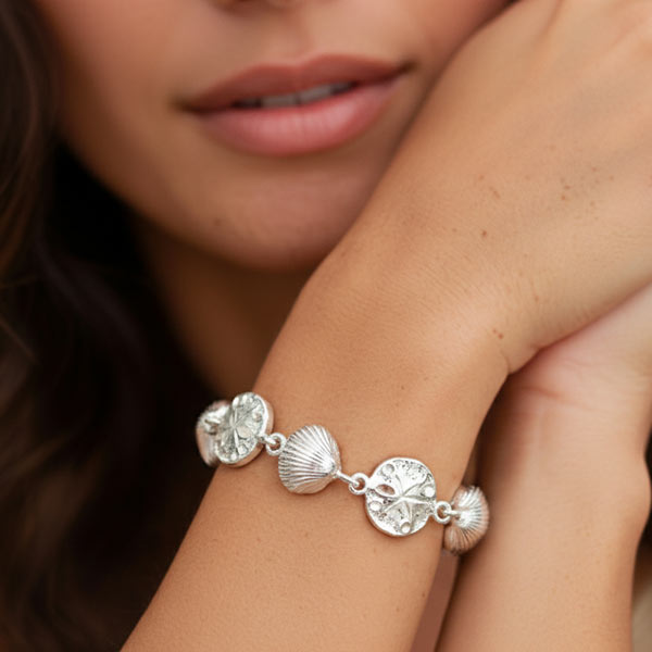 This solid sterling silver 7in seashells and sand dollars bracelet has a lobster clasp. Charm width: 1/2in. Approximate weight: 9.4 grams.