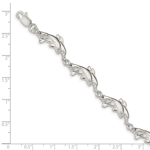 This ladies' solid sterling silver dolphin charm bracelet is made in India. Ships from the USA. Lobster clasp. Bracelet length: 7in. Weight: 12.27 grams.