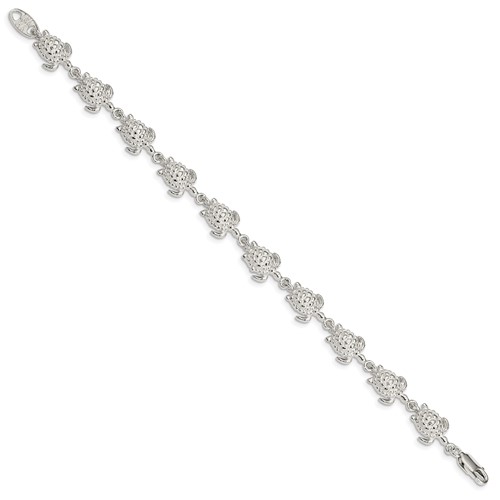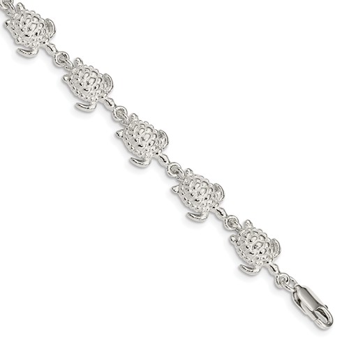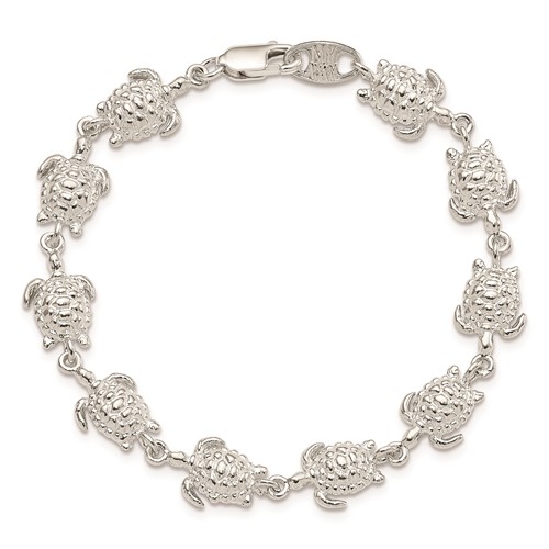 Sea turtles bracelet is made of solid polished sterling silver. Length: 7in. Bracelet width: 10mm. Approximate weight: 10.2 grams. Lobster clasp. Concave back. Made in India. Ships from the USA.