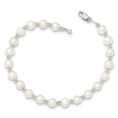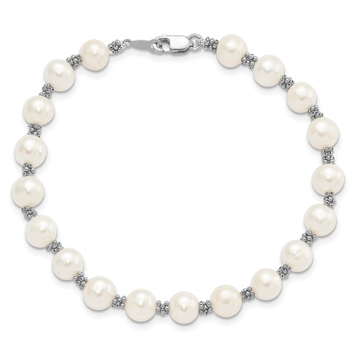 This sterling silver freshwater cultured pearl bracelet has a lobster clasp. Bracelet length: 7.25 inches. Pearls are 6mm in diameter. Weight:1.25 grams. Made in Canada. Ships from USA.
